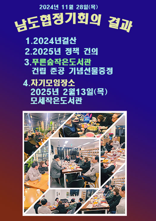 2024년 11월 28일 목요일 푸른숲작은도서관 건립기념 정기모임 페이지 정보 작성자 운영자 댓글 0건 조회 41회 작성일25-06-10 18:59 본문 2024년 11월 28일 목요일 푸른숲작은도서관 건립기념 정기모임 댓글목록 목록 Total 12건 1 페이지 공지사항 목록 번호 제목 글쓴이 날짜 2025년 11월 20일 목요일 전기모임 운영자 6 11-18 남도협 회비 통장입니다(회비는 월 1만원입니다) 운영자 92 09-22 10 남도협 정기총회및 임시총회 결과 운영자 49 06-18 9 남도협 사진으로 만든 영상 운영자 53 06-10 열람중 2024년 11월 28일 목요일 푸른숲작은도서관 건립기념 정기모임 운영자 42 06-10 7 2025년 남도협 정기총회 일정공고 운영자 74 06-10 6 경도협 주관 멘토 멘티 협력사업 공개모집 운영자 60 04-30 5 2024년 작은도서관 실태조사 협조건 운영자 75 01-19 4 2023년 11월 13일 정기회의 결과 공지 운영자 88 11-15 3 2023년 9월 18일 정기회의 모임 결과 운영자 82 09-21 2 남도협 홈페이지를 오픈합니다. 운영자 91 09-14 1 남양주 작은도서관 협의회에 오신것을 환영합니다. 운영자 103 09-12 검색대상 제목 내용 제목+내용 회원아이디 회원아이디(코) 글쓴이 글쓴이(코) 검색어 필수 검색